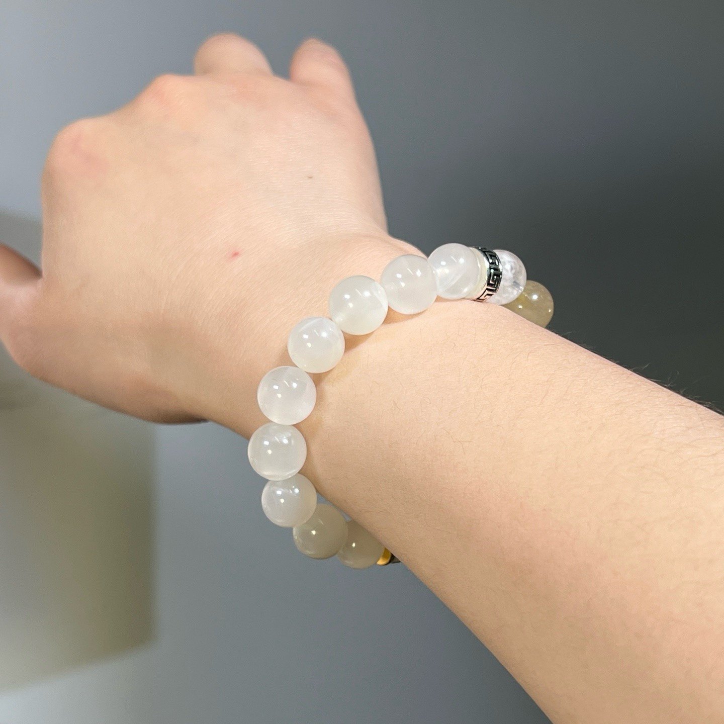- Contains Golden Rutilated Quartz, Snowflake Phantom Quartz, White Moonstone, and Clear Quartz.