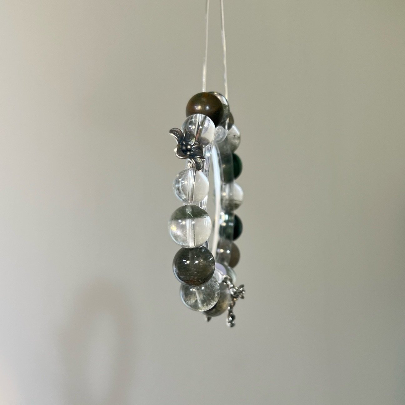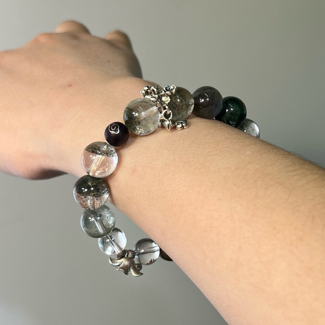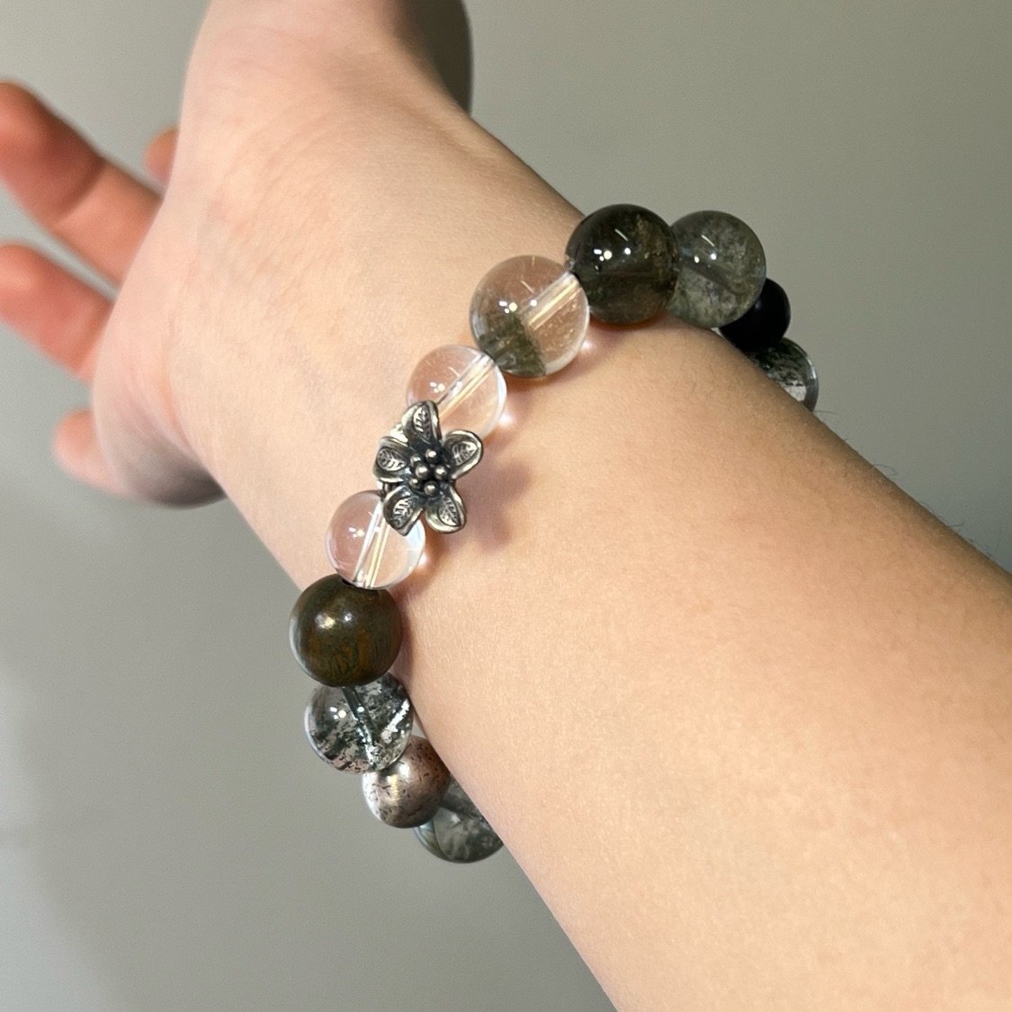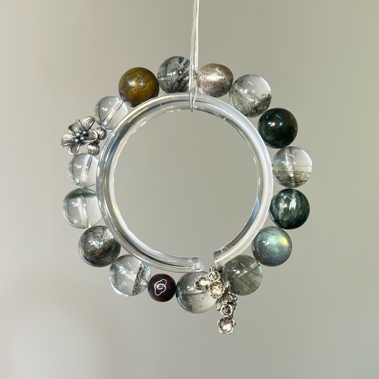 Green sandalwood carries a subtle, lasting fragrance that purifies the spirit and brings inner peace. The serpentine patterns of green dragon crystal resemble a coiled dragon, symbolizing protection and strength, helping you move forward fearlessly. Green phantom quartz holds hidden visions within, a metaphor for vitality and wealth, symbolizing good fortune and abundance. Gray moonstone radiates a soft glow, carrying the beautiful meaning of soothing emotions and aiding sleep, offering comfort to a weary heart. Small-leaf red sandalwood is warm and fine in texture, embodying the steadiness accumulated through time.