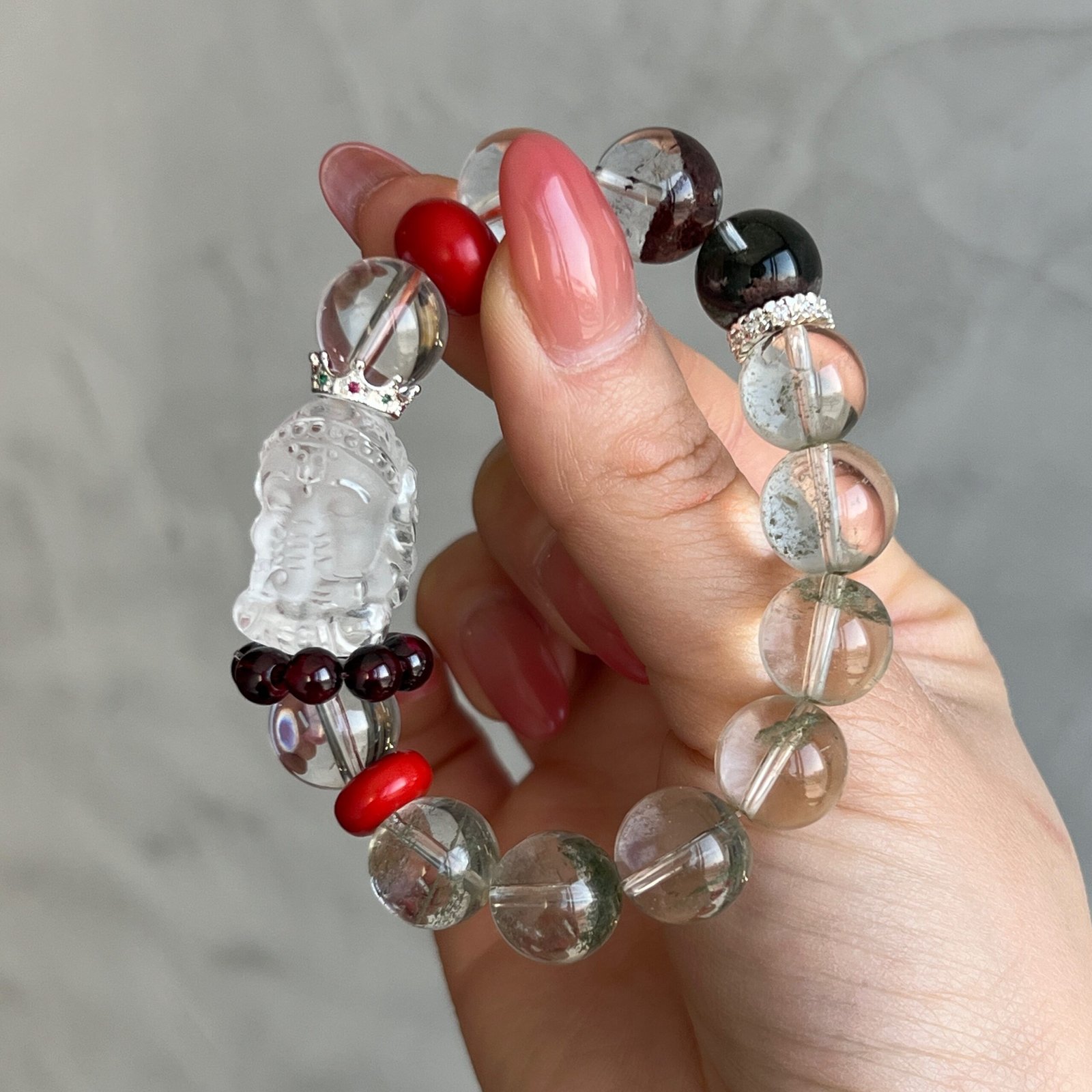 The bracelet is adorned with Four Seasons Phantom Quartz and Starry Phantom Quartz, symbolizing the turning of seasons and the brilliance of countless stars. Green Phantom Quartz, also known as the “Wealth Phantom,” carries the energy of prosperity and career growth, attracting abundance and good fortune. Cinnabar provides protection, peace, and spiritual grounding.