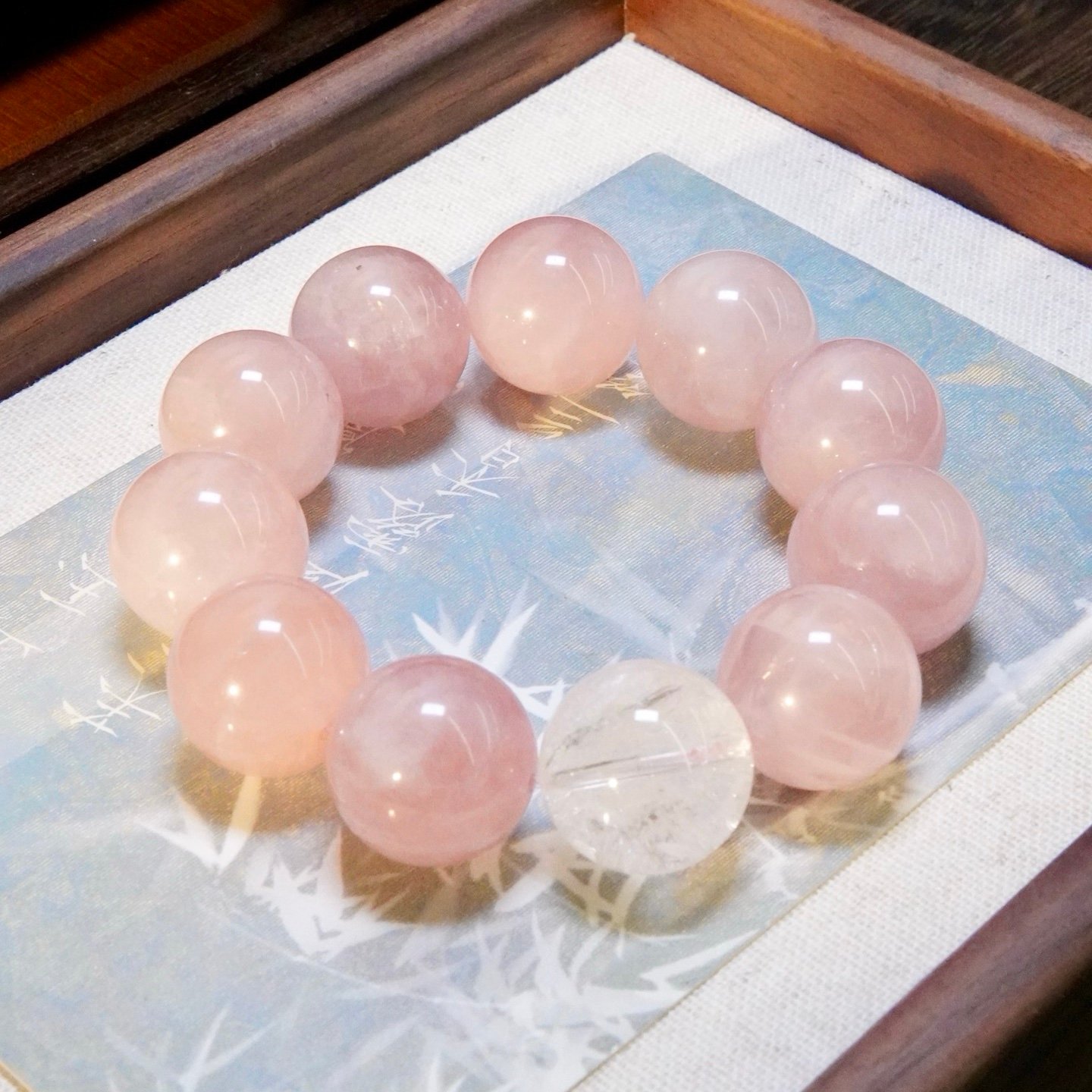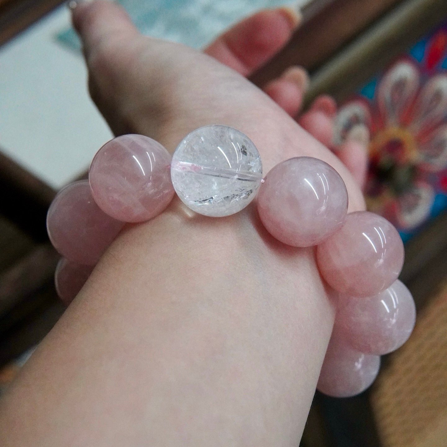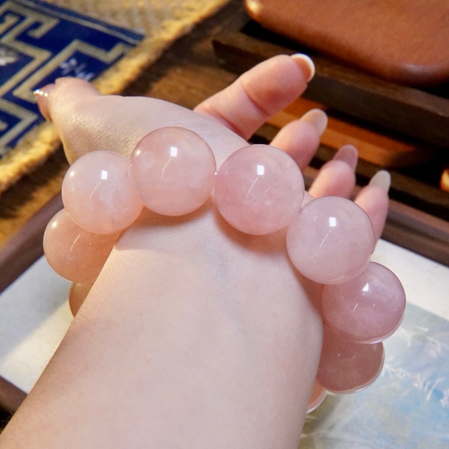 Rose Quartz (The Bloom of Love): Known as the ultimate stone of unconditional love, these oversized Rose Quartz beads act as a magnet for “Peach Blossom” luck (桃花运). It enhances your charisma and attracts positive interpersonal relationships, surrounding you with a gentle, loving aura.